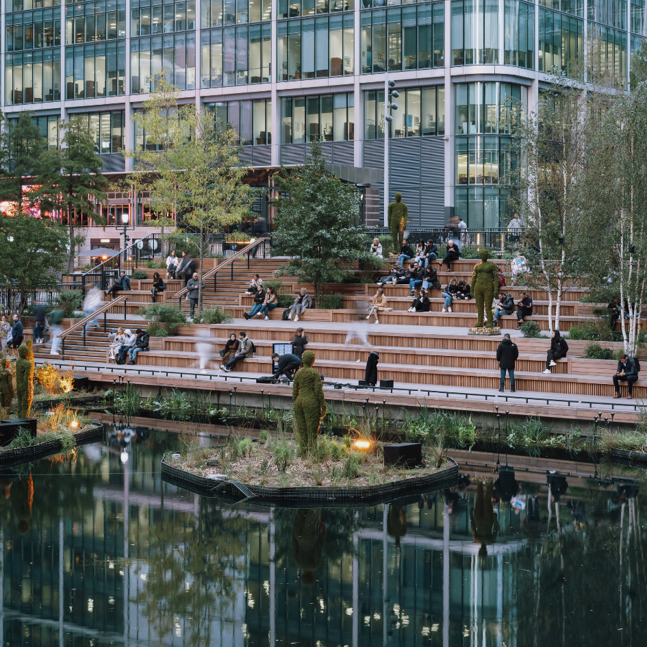 The 1.55-hectare site, funded by Canary Wharf Group, showcases nature-led placemaking. It features a 325-metre enclosed waterway with timber bleacher seating, gardens and walkways which bring the public realm down to the water. A cantilevered aquatic shelf supports saline-resistant plants and protects the public. With 55 per cent biodiversity net gain, the area includes floating islands, accessible walkways, seating and ramps, encouraging educational engagement, environmental monitoring and improved connectivity.