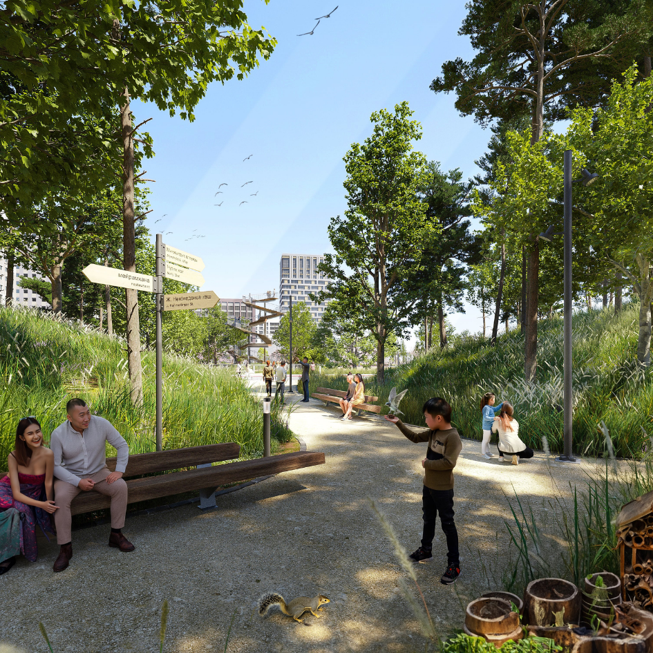The Akimat, Astana’s governing council and project sponsors, has been involved at every stage of public consultation with community meetings and outreach, marking a shift toward greater openness and engagement. The project benefits from the Akimat and the Centre of Urbanism placing health, wellbeing and nature at the forefront of political and societal priorities, in part because of recent floods and fires in Kazakhstan. An Astana GenPlan has directed the city’s development so far. However, its recent refresh failed to meet the expectations of politicians and citizens, given the growing recognition of an urgent need for a better balance between growth and environmental management. The country is implementing the Kunming-Montreal Global Biodiversity Framework and Astana itself aims for 52% green cover by 2030 in its greening policy. The discussion around the masterplan for Mynzhyldyk Alley has revealed strong appetite to see tangible improvements. In fact, residents have called for an eco-city vision, with green corridors connecting suburban forest belts to urban parks. They want the benefits from green spaces, cleaner air that’s also cooler in summer, carbon capture, stronger biodiversity and better mental health.