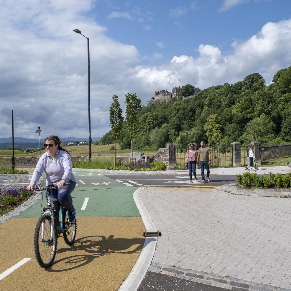 The project delivers two transport corridors: the City Centre to Forth Valley College Route and the Stirling Station to University Route. Both routes create safe, attractive active travel routes starting from Stirling train station through the centre of Stirling to educational centres. The routes are aligned with key trip generators for locals, including schools and shops, and make the most of Stirling’s heritage, with connections to Stirling Castle and Stirling Old Bridge. Walk, Cycle, Live, Stirling has improved direct links to rail and bus transport hubs for locals and tourists. Walk, Cycle, Live Stirling provides 6.5km of active travel infrastructure, consisting of segregated cycle lanes, Cycle Street treatments, and traffic calming measures.