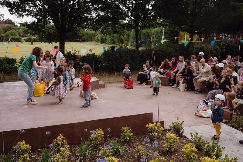 Located within a conservation area the site is surrounded by a variety of This space brings people together every day by offering anyone a place to sit and play. Community members are invited to hold events there – even yoga or baby groups. The launch event included performances by a local street dance community group, drumming group and children’s entertainer, as well as mask-making activities for children. Since then, the theatre is informally in constant use by children rehearsing on the stage, people eating lunch, children playing there. The project has succeeded to engage and inspire the local community to get involved in theatre and creative arts. The social benefits are enormous, facilitating theatre for the community and reducing anti-social behaviour. Environmentally the robust design of the project activates this neglected corner of the park, and re-landscapes around the theatre, promoting biodiversity.