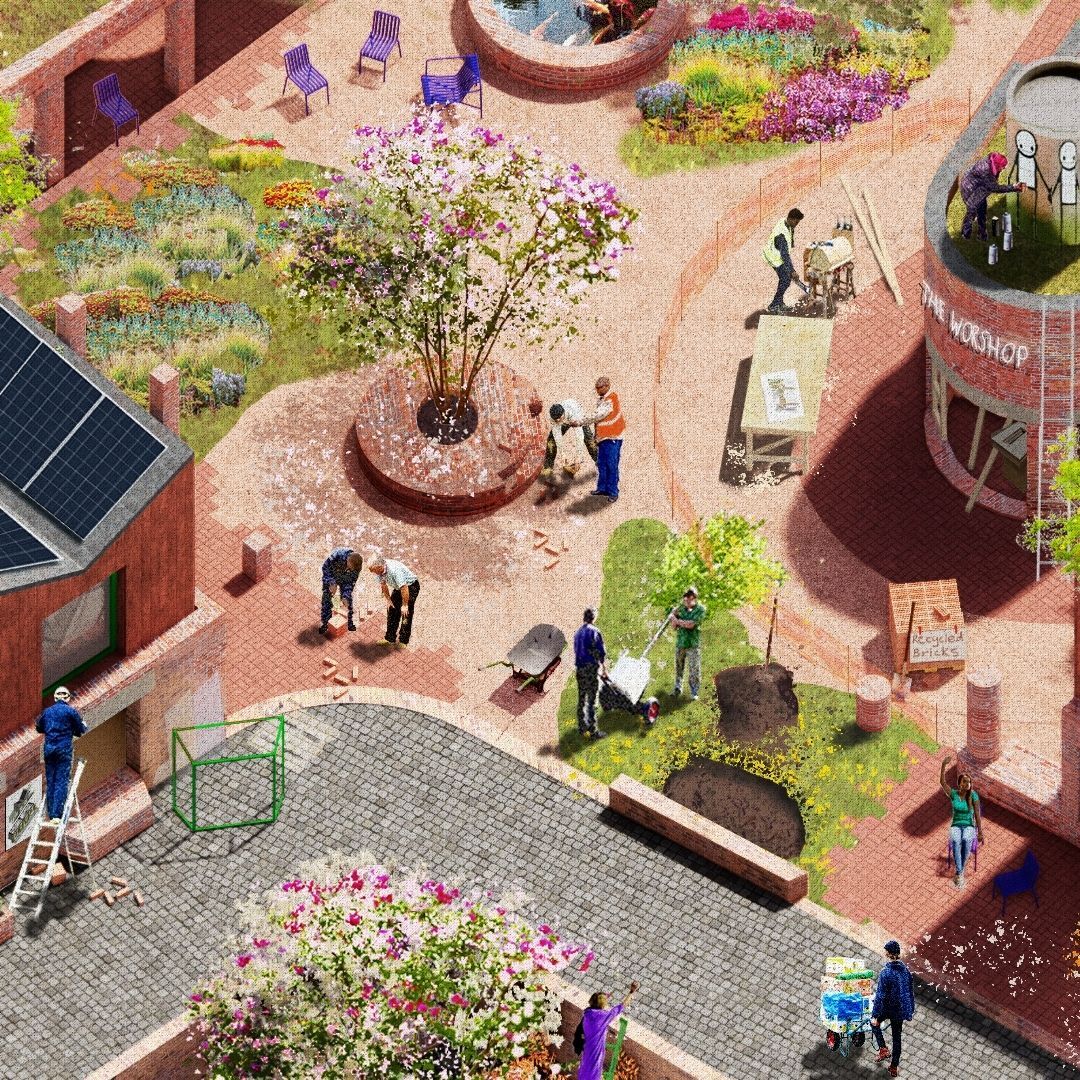The central design strategy for Helping Hands is to re-appropriate existing space for developing uses. By nature, the project promotes reusability on a site-wide level, encouraging both material and functional circularity. Existing structures are reused and retrofitted where possible, integrated as part of the scheme to implement areas of backland which may usually be overlooked. The workshop which is developed as a later part of the project reuses an existing brick garage - opening it out to the main pathway and becoming a central hub for both learning and construction. Within its building scope, Helping Hands proposes construction training for residents and site-users. This will support upskilling and promote future labour, but will also limit the ‘delivery footprint’ by encouraging local, small-scale development. The project’s emphasis on green space promotes biodiversity uptake and the creation of on-site food production – decreasing the masterplan’s food-related carbon footprint. Where new builds are proposed, both timber frame construction and cladding are used as their main material component, allowing for an overall lower embodied carbon impact to the environment. The design of each of the homes inclusive of footprint are curated in a way in which provides optimum space for users, building smaller yet more crafted spaces for its inhabitants. The roof is designed to optimise solar power as a renewable energy source for each of the homes, helping to offset the long term carbon footprint of the scheme.