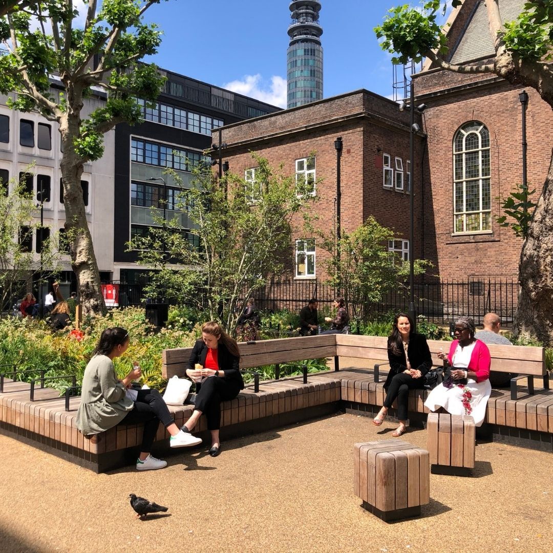 Starting in 2014, WEP completed in 2023. Working with the community was a priority from the outset and initial engagement reached over 1,300 responses from residents, businesses and local interest groups which shaped the project. A series of well-publicised workshops and pop-ups in the spaces, backed up by online activity, captured hundreds of meaningful conversations. Greening and nature came up in nearly all conversations, as did the need for generous seating in an area desperately short of quality public spaces. The retention of mature tree canopies was consistently integral to all designs, for beauty and cooling. All the spaces that make up WEP bring people together and strengthen wider connections, with each providing a sociable setting for life to play out. Whitfield Gardens features communal dining and movable seating; Alfred Place Gardens feature long, sculptural seating ideal for chatting. Spaces have been designed to be flexible to support community events. Generous play has been incorporated to cater for families. By creating green spaces people want to spend time, and equitable spaces for lots of different people, dwell time has increased. On Tottenham Court Road, cycling is up both in the week and on the weekend and congestion has been reduced by up to 70% during restricted hours. Traffic on Gower Street has also been reduced by up to 45%.